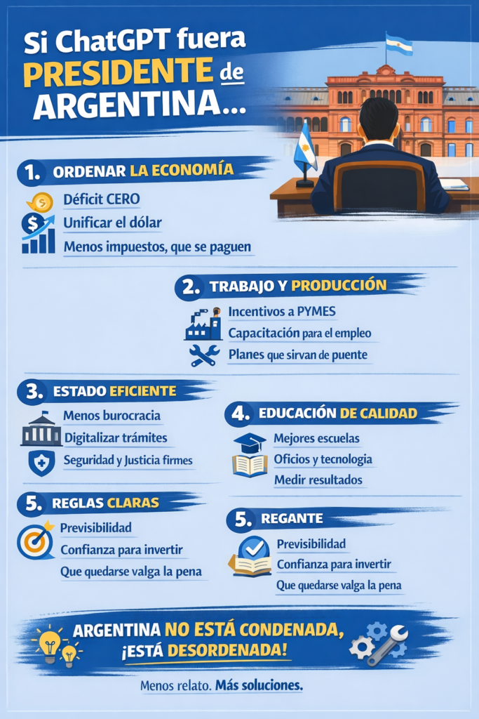 “Uff… si me sentara en el sillón de Rivadavia 😅 y tuviera poder real, haría algo muy poco argentino: ordenar lo básico antes de prometer épica. Te lo cuento claro y sin humo.